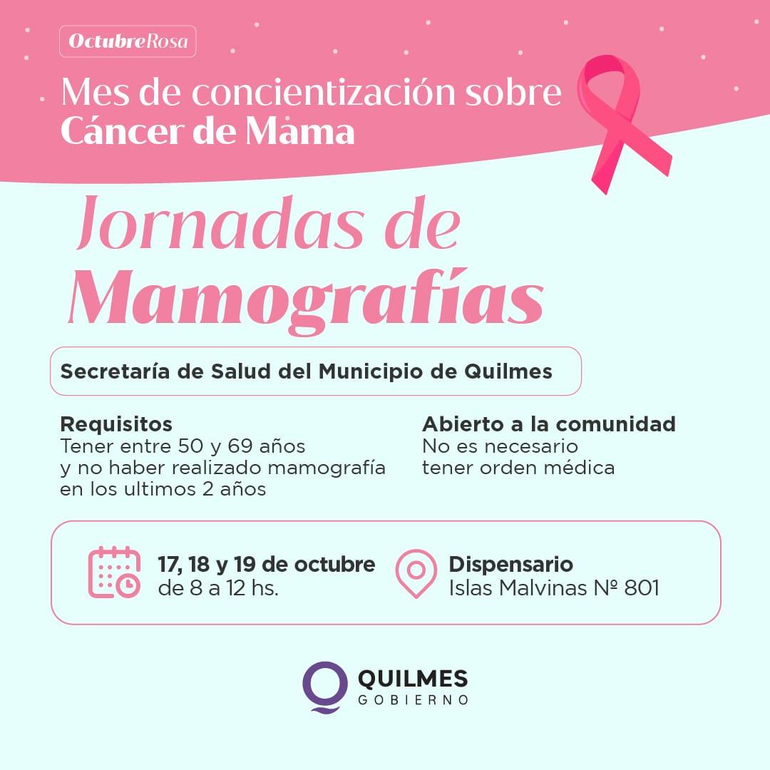 En primera instancia, el 17, 18 y 19 de octubre se realizarán jornadas de mamografías de 8 a 12, en el Instituto Municipal de Medicina Preventiva Dr. Ramón Carrillo (ex Dispensario), ubicado en Marcelo T. Alvear esquina Islas Malvinas, en Quilmes Oeste, que están dirigidas a mujeres de entre 50 y 69 años que no se hayan realizado ese estudio en los últimos dos años. Este servicio es abierto a la comunidad y gratuito, con atención por orden de llegada y sin necesidad de orden médica.
