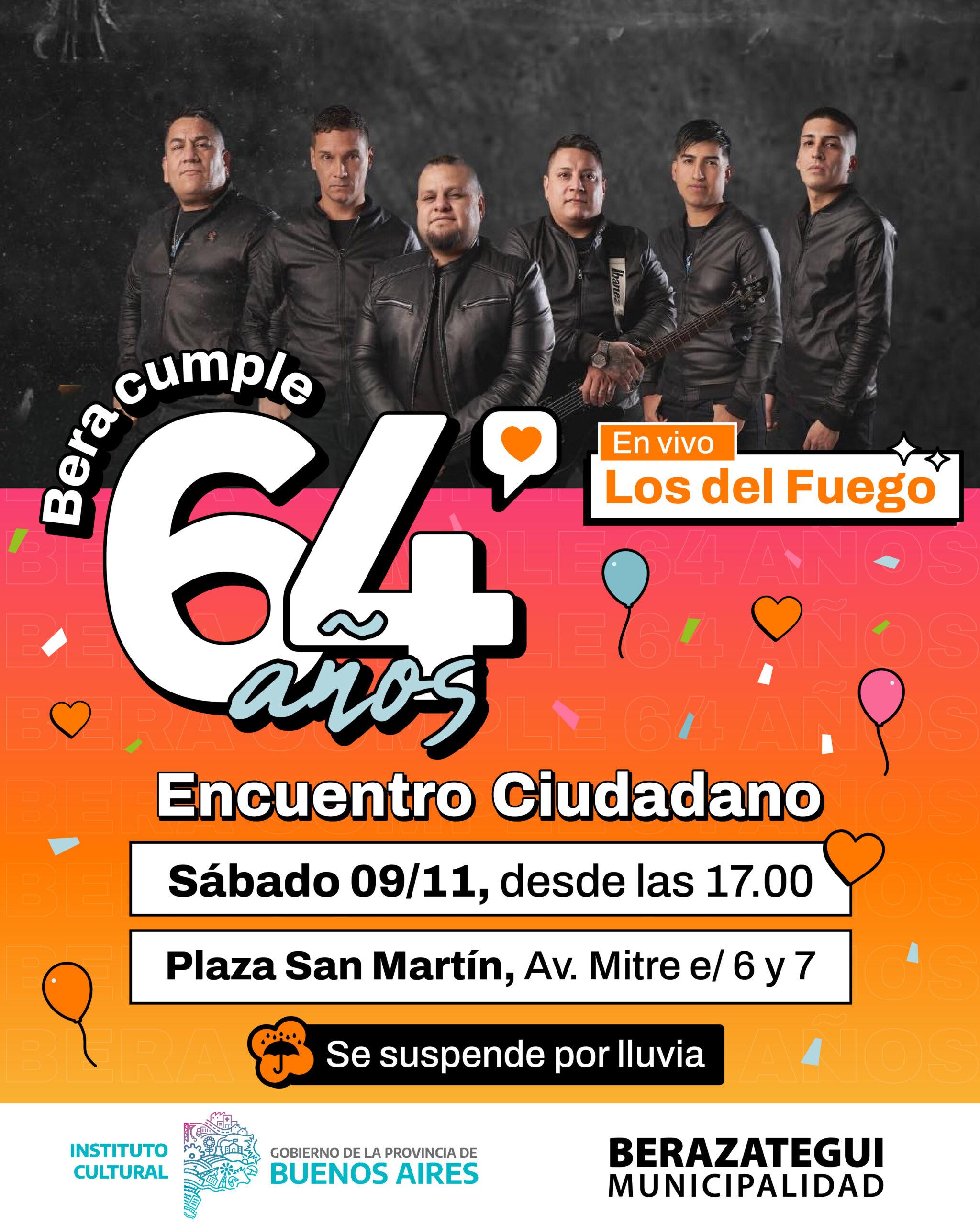 En el marco del 33° Encuentro Ciudadano por la Autonomía, Berazategui festejará su 64° aniversario. Será este sábado 9 de noviembre, a partir de las 17.00, en la Plaza San Martín (Av. Mitre e/ 6 y 7), con el show en vivo de Los del Fuego -la mítica banda de cumbia santafesina- para celebrar a todo ritmo. El evento, de acceso libre y gratuito, se suspenderá en caso de lluvia.