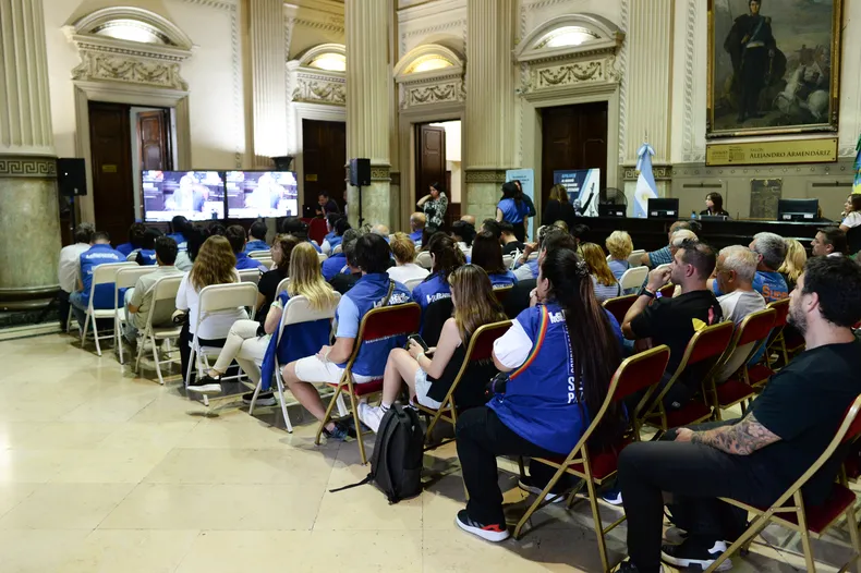 Para apoyar el proyecto llegaron al Senado trabajadores y militantes del gremio La Bancaria, que observaron la sesión desde el hall de ingreso vía pantalla gigante y celebraron el avance de la norma. Con una interna en modo off, el oficialismo necesitó los votos de toda la bancada de Unión por la Patria y del bloque La Libertad Avanza -que no es línea Casa Rosada, ese es La Libertad Avanza 1- para superar las manos de los libertarios, el PRO y la UCR + Cambio federal. La bancada que acompañó a Kicillof mantuvo el suspenso hasta minutos antes de la sesión.