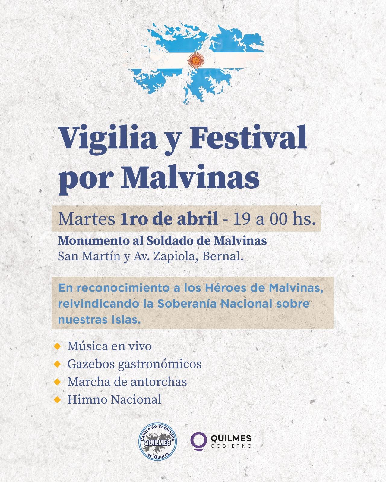 El martes, desde las 19, se realizará la Vigilia de los Veteranos, en el monumento al Soldado de Malvinas, ubicado en las avenidas San Martín y Zapiola, en Bernal, que contará con un festival cultural y gastronómico, en el que se reivindicará la soberanía nacional sobre las Islas, con conciertos en vivo de diversas bandas musicales y la feria para degustar gastronomía de colectividades.