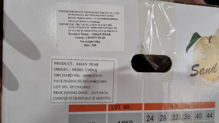 Este lunes se produjo un hecho inédito en el comercio agroalimentario argentino: la llegada de las primeras peras frescas provenientes de China (de la variedad Crown) al Mercado Central de Buenos Aires (MCBA). El cargamento total, compuesto por 2.597 cajas de 10 kilos cada una y de las cuales una parte fue al MCBA, fue enviado por la firma Botou Dongfang Fruit Co., Ltd. y tiene un peso total de 17,5 toneladas. Su valor estimado ronda los 183.000 yuanes (unos 25.420 dólares). El precio de comercialización en el mercado porteño fue fijado en 45.000 pesos por caja, lo que equivaldría a unos 4.500 pesos por kilo. Un valor muy por encima de lo que está cotizando hoy la pera de origen nacional en el mercado.