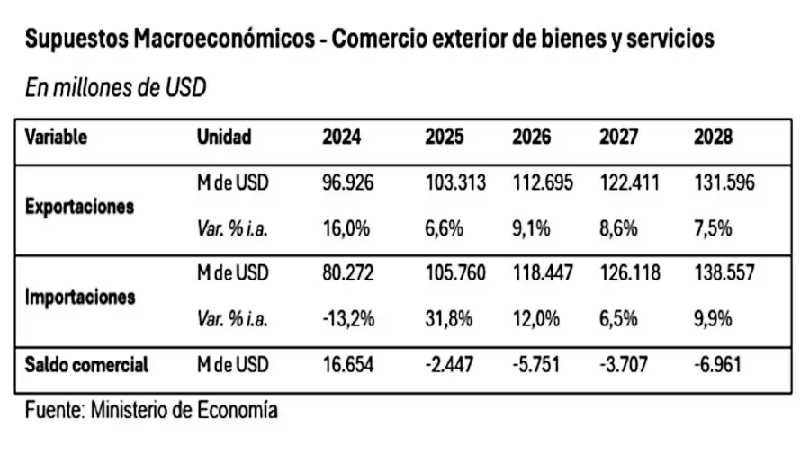 Pero en las proyecciones del Presupuesto 2026 se estima que para 2027 y 2028 las exportaciones alcanzan los USD 122.411 millones y USD 131.506 millones, como así también las importaciones sean de USD 126.118 millones y 138.557 millones, respectivamente. Esto arrojaría que el déficit comercial sería de USD 3.707 millones en dos años y el rojo se incremente a USD 6.961 millones en tres años.