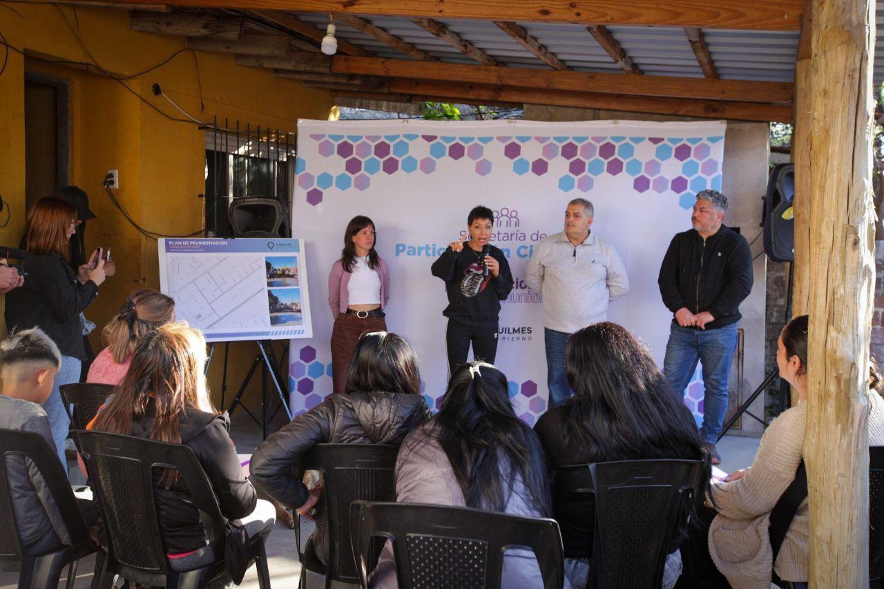 La intendenta de Quilmes, Mayra Mendoza, encabezó este jueves un encuentro de participación ciudadana en compañía de funcionarios, junto a vecinos y vecinas de la zona de las calles 855 y 885, de Villa la Florida, donde anunció la construcción de pavimentos para el barrio, desarrollados con un 100% de inversión comunal.