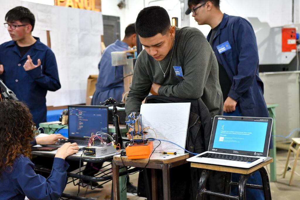 “Presentamos un brazo robótico con funcionamiento a partir de códigos de programación”, detalló Federico, de Electromecánica. “Fue una tarea complicada. Al principio, no entendía cómo hacerlo, pero fue lindo comprender el proceso completo”, compartió.