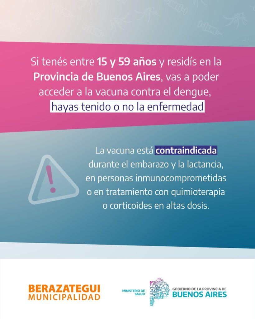 Con una amplia cobertura en Berazategui y en todo el territorio de la provincia de Buenos Aires, avanza la Campaña de Vacunación contra el Dengue, orientada a todas aquellas personas de 15 a 59 años que hayan padecido o no la enfermedad. Este servicio llegará a los vecinos y vecinas, de manera pública, gratuita y sin el requerimiento de una orden médica, gracias al trabajo conjunto entre el Gobierno bonaerense de Axel Kicillof y la gestión municipal encabezada por Juan José Mussi.