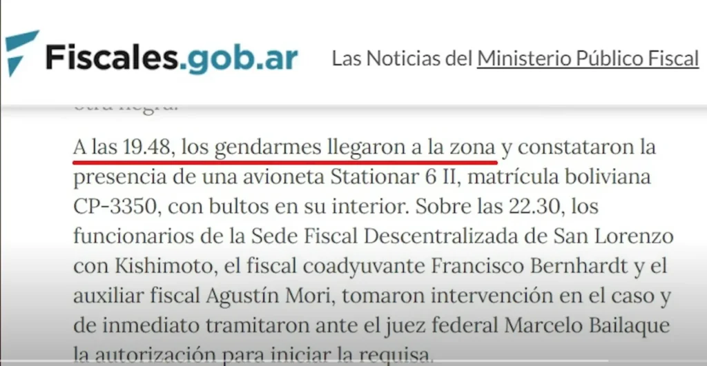 Lo real es que la nave aterrizó a las 17.30 y Gendarmería, y según el detalle que se dan en la causa tramitada por el juez llegaron más de dos horas después, a las 19.48. Recién al otro día lograron dar con el piloto quien, lejos de huir en camioneta, lo había hecho a campo traviesa y semidesnudo y lo encontraron en una barranca del Carcarañá. Del tema, el gobierno no habló más, quizá porque el piloto detenido era un militar boliviano, Oscar Armando Caba Hurtado, que había participado de la “masacre de Sacaba”, considerada delito de lesa humanidad por el asesinato de diez civiles el 15 de noviembre de 2019 durante el levantamiento de Jeanine Añez contra el gobierno legítimo de Evo Morales. Tres días antes Patricia Bullrich había enviado gendarmes y armamento para apoyar a los golpistas, entre los que estaba Caba Hurtado; por esa razón Bullrich está imputada por contrabando agravado de armas y municiones.