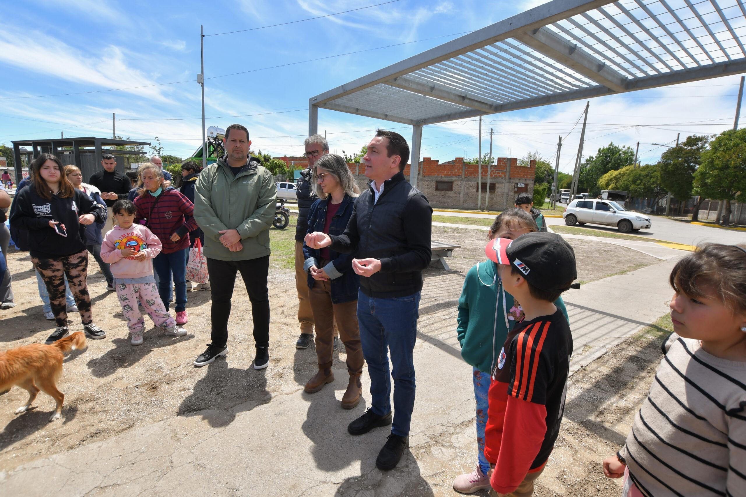 El jefe comunal -Andrés Watson- junto a la presidenta de la Fundación Banco Provincia -Micaela Ferraro- conversó con frentistas tras la finalización de la puesta en valor del parque ubicado en calle 523 esquina 554, lindero a la edificación de un nuevo inmueble sanitario de atención primaria.