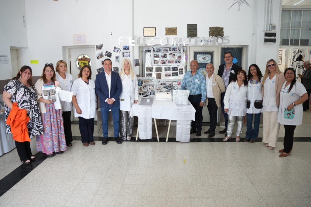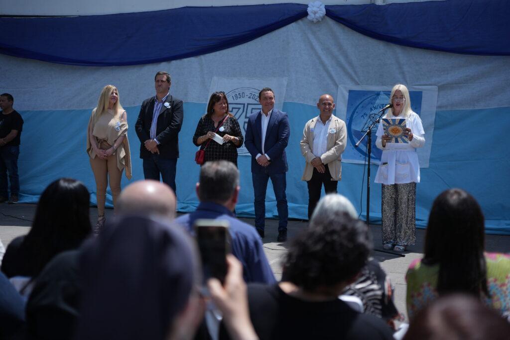 El intendente Andrés Watson, educadores, auxiliares, estudiantes, representantes de entidades sociales compartieron una ceremonia para conmemorar el 75° aniversario del establecimiento en el patio de la E.P. N°1, ubicada en Batalla de Chacabuco N°89 el sábado a la mañana.