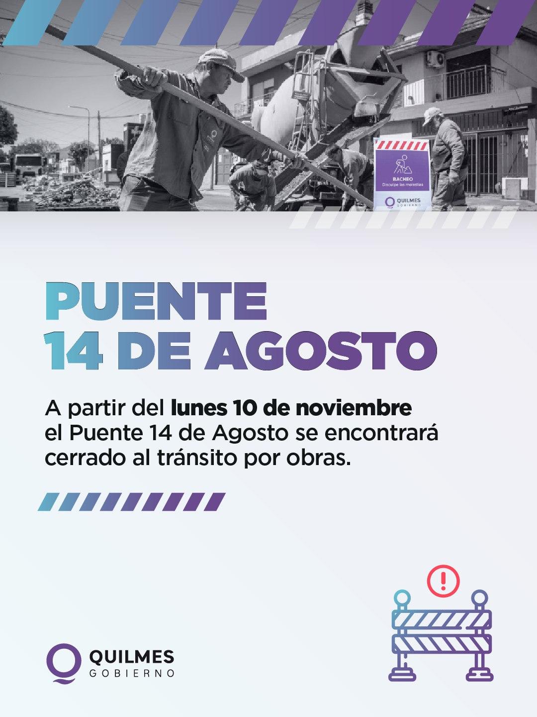 El Municipio de Quilmes informa que a partir del lunes 10 de noviembre el puente 14 de Agosto se encontrará cerrado al tránsito debido a la realización de obras de mejoramiento integral en el mismo.