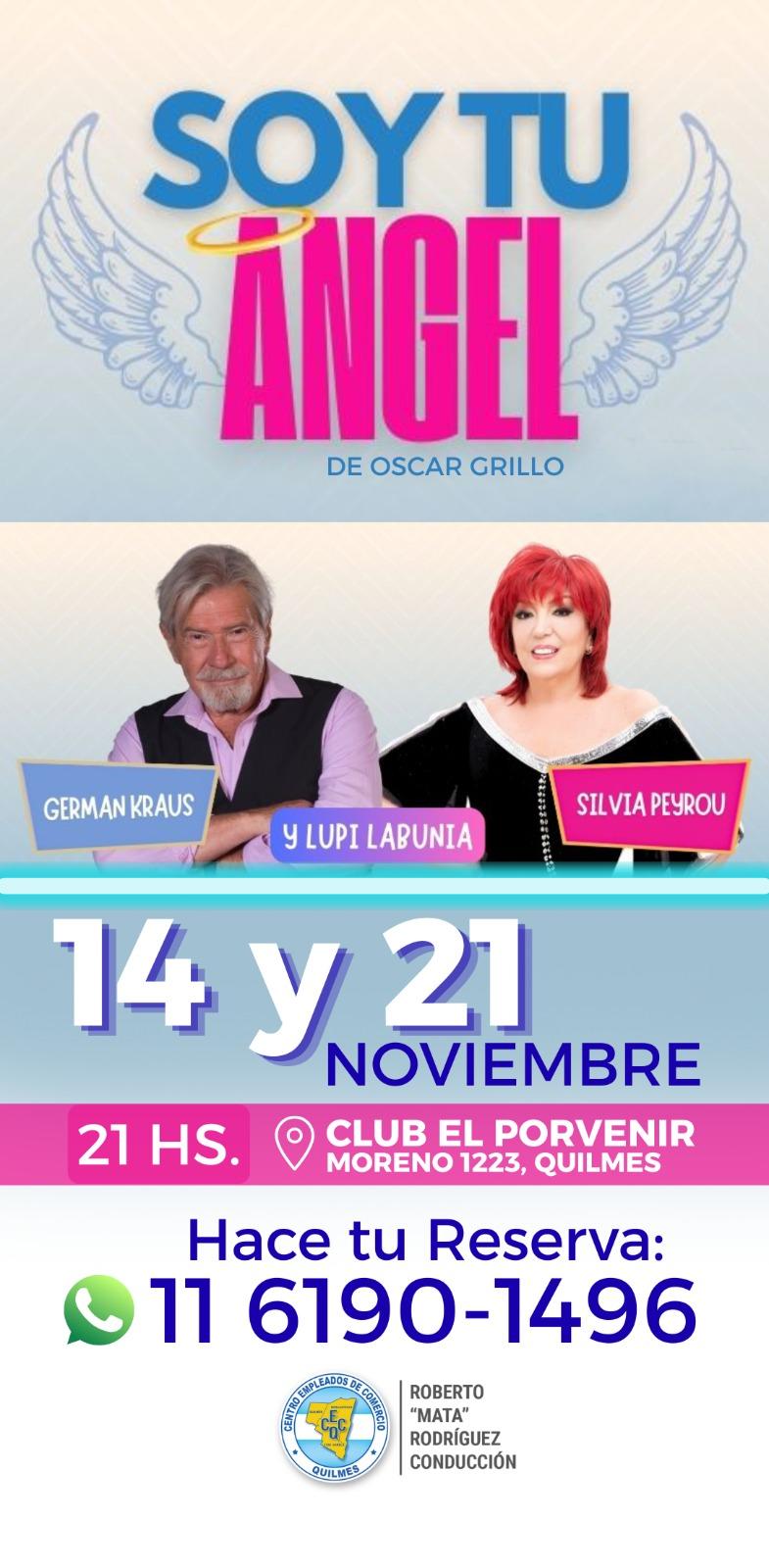 Con dos funciones de la premiada obra «Soy tu Ángel» de la mano de German Kraus y Silvia Peyrou, las veladas se realizarán en el Club El Porvenir sito en la calle Moreno 1223 de Quilmes, los días 14 y 21 de noviembre desde las 21 h.