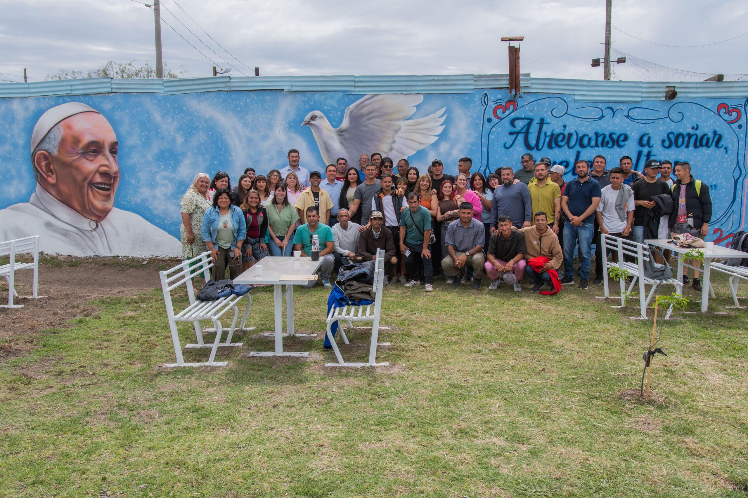 El amplio patio delantero tenía dos gazebos donde el reconocido barbero “Checho Style” acomodó sus elementos. Con su equipo, realizaron diferentes looks a los vecinos residentes en los hogares “Jorge Novak” y “Vivir Libre”. Artistas municipales lucían una obra culminada: un mural con la imagen del Papa Francisco.