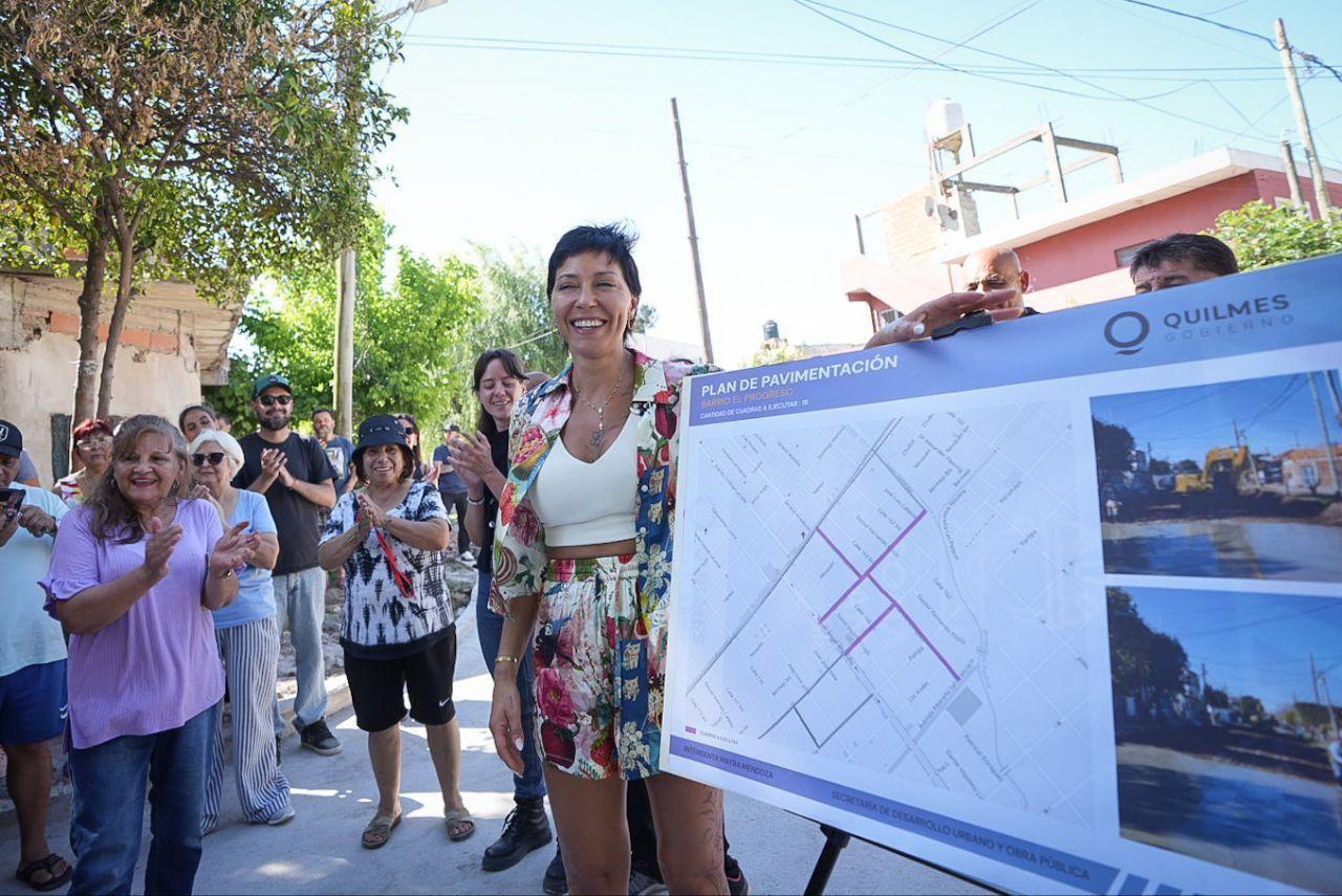 La intendenta de Quilmes, Mayra Mendoza, supervisó este miércoles el avance de las obras de pavimentación que se están desarrollando en el barrio El Progreso, de Bernal Oeste, una obra que se realiza con fondos 100% comunales.