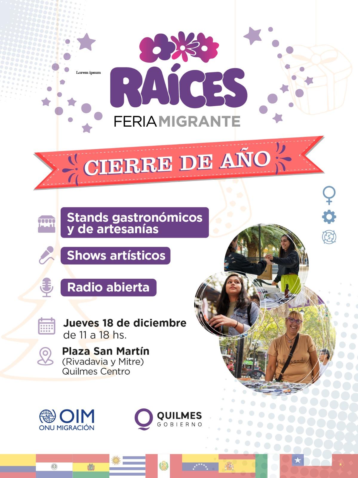 Raíces es un programa municipal creado en 2024 con el apoyo de la Organización Internacional para las Migraciones (OIM), destinado a acompañar e impulsar a mujeres migrantes emprendedoras a través de capacitaciones, espacios de comercialización y dispositivos de sensibilización comunitaria. Desde su lanzamiento, se realizaron 17 ferias propias, diversos talleres y capacitaciones, entre otras actividades.