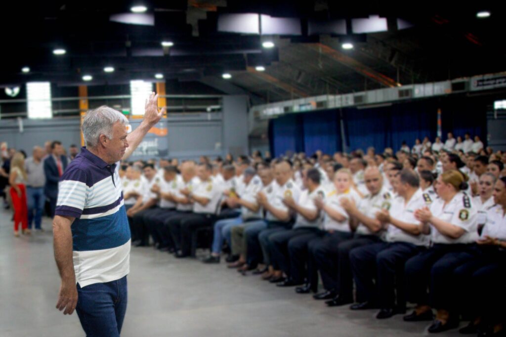 El acto también contó con la presencia del resto de los integrantes del Gabinete municipal y unos 250 agentes policiales, en representación de la Jefatura Departamental, Comando, GRI, Cibercrimen, Comisaría de la Mujer y la Familia; las Comisarías 1°, 2°, 3°, 4° y 5°; los destacamentos de Villa España y Pereyra; y la Policía Local.