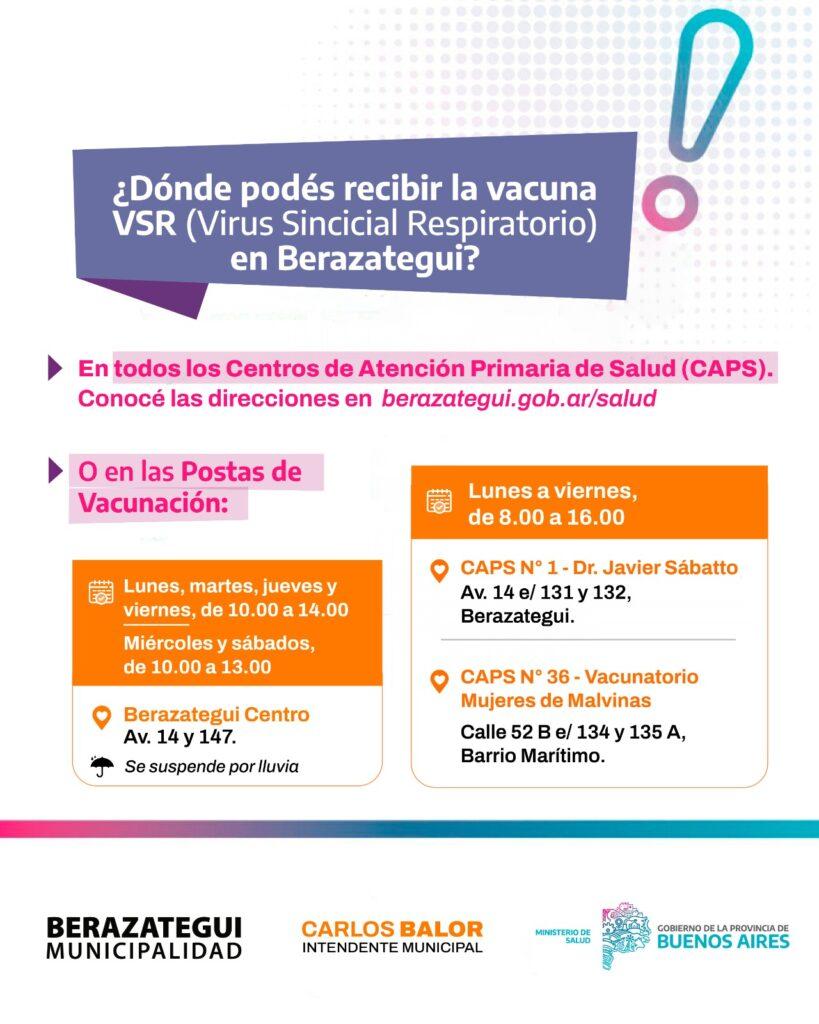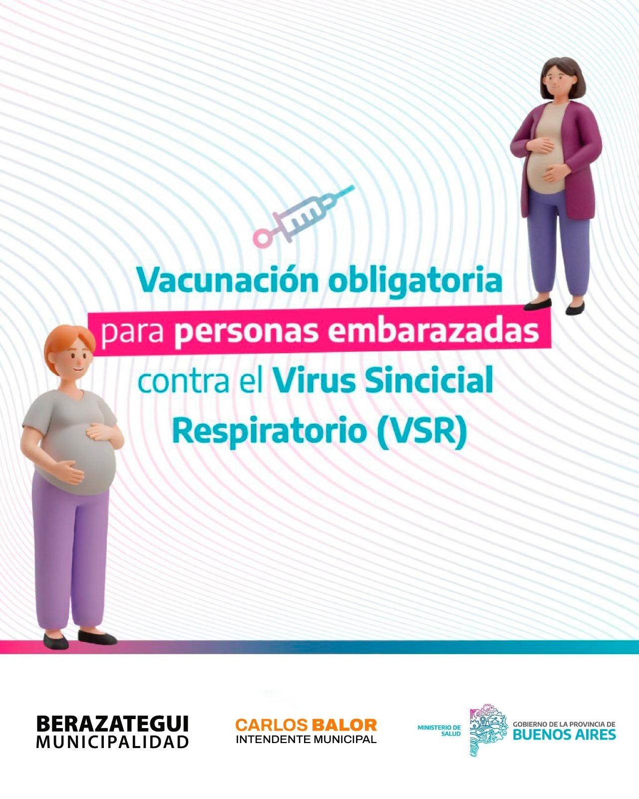 La Municipalidad de Berazategui informa que ya se encuentra disponible la vacuna contra el Virus Sincicial Respiratorio (VSR), destinada a las personas gestantes entre las semanas 32 y 36, inclusive. Este virus es la primera causa de bronquiolitis y afecta principalmente a menores de un año. En ese sentido, la vacuna previene las formas graves de dicha enfermedad respiratoria.