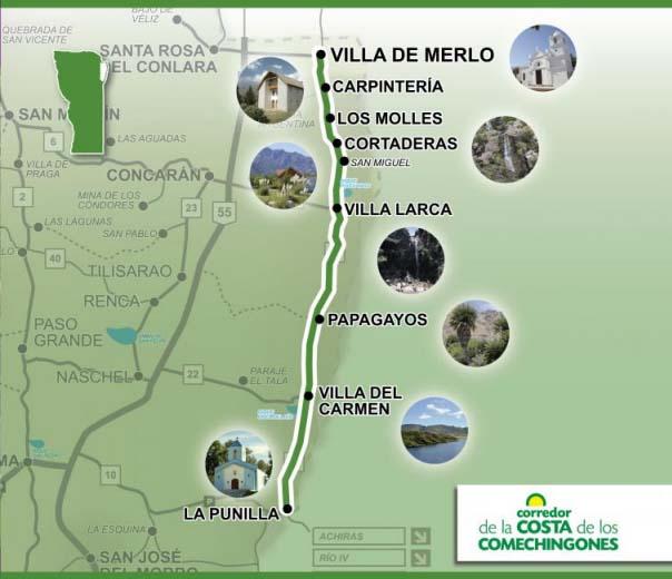 Villa de Merlo, epicentro del corredor, se destaca por su microclima único y vida social, junto a la Reserva Natural Mogote Bayo; el Camino del Filo; Piedra Blanca, ideal para senderismo, observación de flora y fauna, como el cóndor andino, y paseos con vistas espectaculares del Valle del Conlara. Además de sus atractivos culturales, actividades al aire libre y gastronomía de primer nivel.