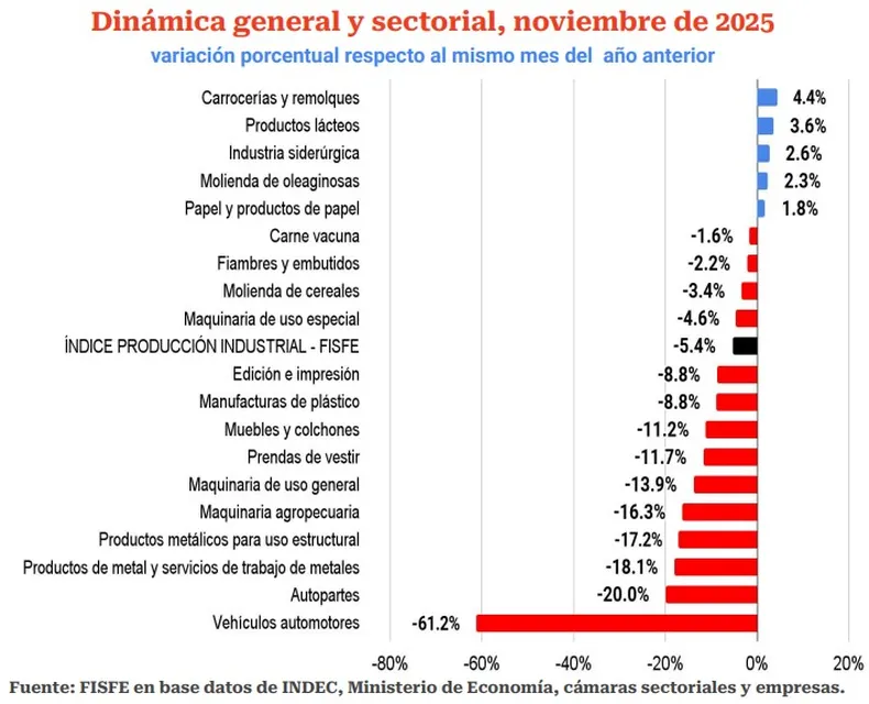 El impacto sectorial mostró un mapa dispar. Solo cinco de las 19 actividades registraron crecimiento: Carrocerías y remolques (4,4%), productos lácteos (3,6%), industria siderúrgica (2,6%), molienda de oleaginosas (2,3%) y papel y productos de papel (1,8%). El resto presentó retrocesos, con caídas marcadas en maquinaria agropecuaria (16,3%), productos metálicos para uso estructural (17,2%), productos de metal y servicios asociados (18,1%), autopartes (20%) y vehículos automotores, que encabezó el derrumbe con una baja del 61,2%.