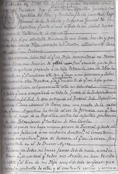 3° El sable que me ha acompañado en toda la guerra de la Independencia de la América del Sud, le será entregado al General de la República Argentina Dn Juan Manuel de Rosas, como una prueba de la satisfacción que como Argentino he tenido al ver la firmeza con que ha sostenido el honor de la república contra las injustas pretensiones de los Extranjeros que trataban de humillarla. (Extracto del testamento de San Martín).