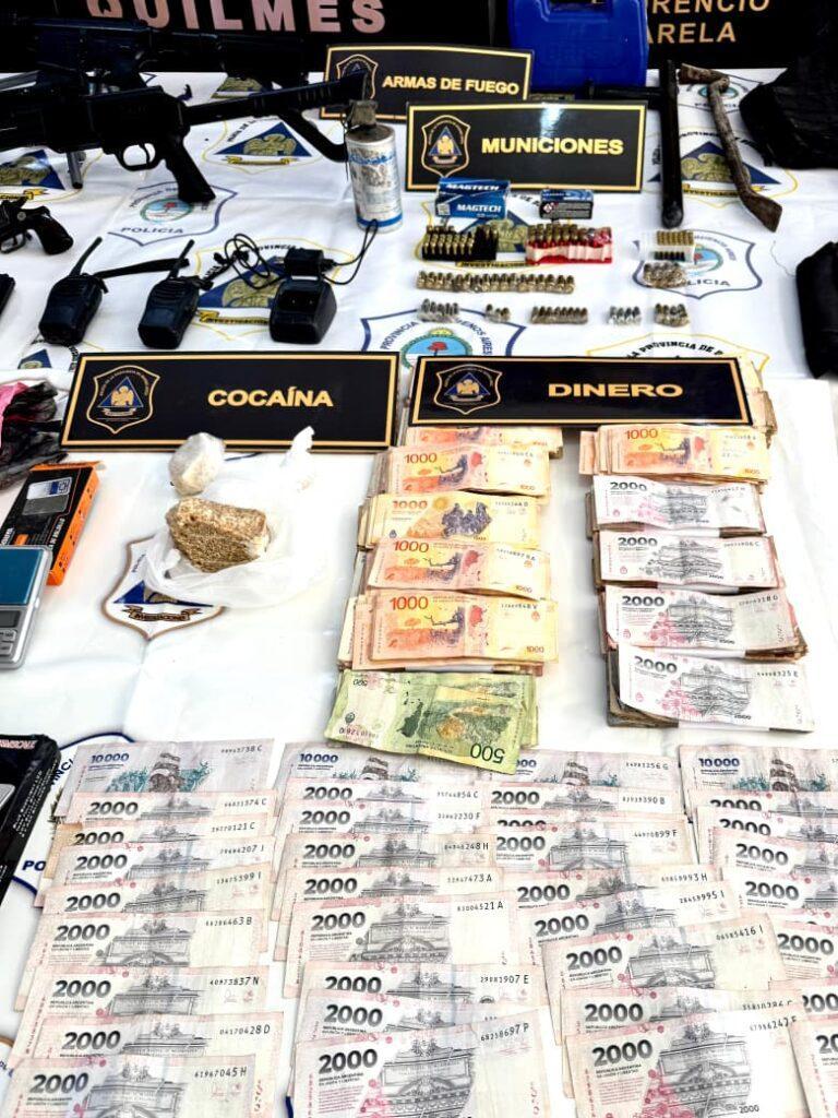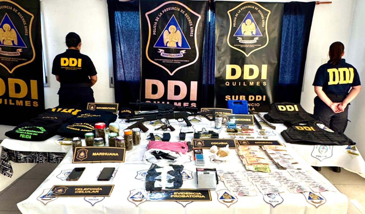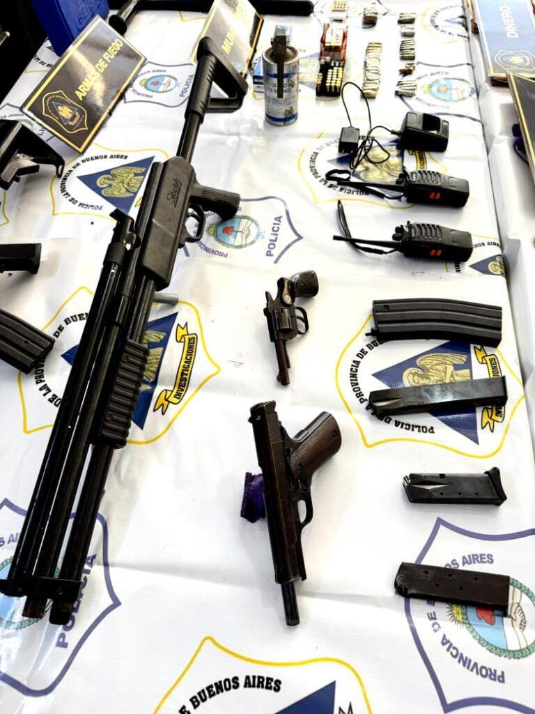 En los operativos, los uniformados detuvieron a los involucrados y decomisaron: un fusil de asalto, una escopeta, una pistola calibre 45, una granada de humo, tres handy, una tonfa, dos chalecos antibalas sin numeración, municiones, cargadores, una suma de $280.000, 450gm de marihuana, 365gm de pasta base, dos balanzas de precisión, recortes de nylon e indumentaria policial.