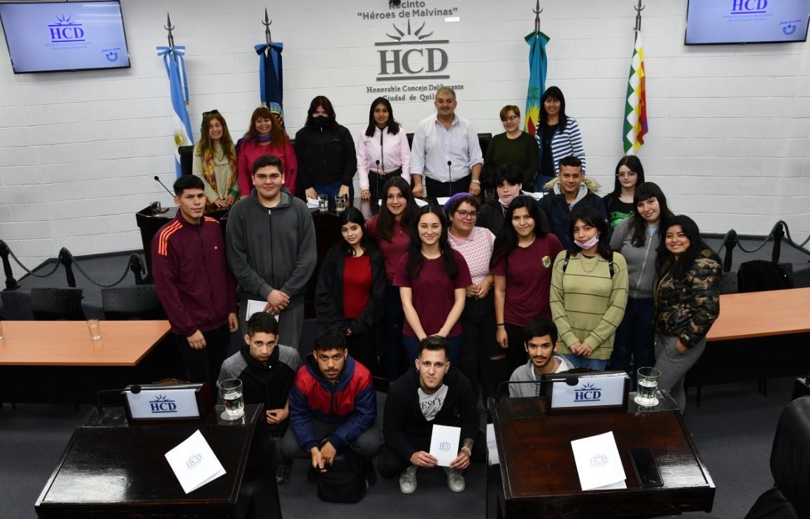 Alumnos de 6° año de la Escuela de Educación Secundaria N° 30 “María Luisa Bemberg” de Quilmes Oeste, junto a la vicedirectora del establecimiento educativo Sylvia Verri y las profesoras de Economía Política Andrea Ferrari y Liliana Claros, participaron del Programa que lleva adelante el Concejo Deliberante en articulación con la secretaría de Educación que vincula a estudiantes y docentes con la actividad legislativa.