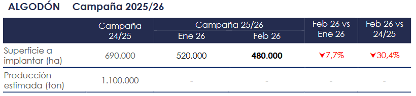 En tanto, en la presente campaña 2025/26 el área nacional de algodón –que se concentra en gran medida en Chaco– descendió un 30% respecto a 2024/25 a causa de demoras durante la siembra provocadas lluvias abundantes y la escasa rentabilidad proyectada del cultivo.