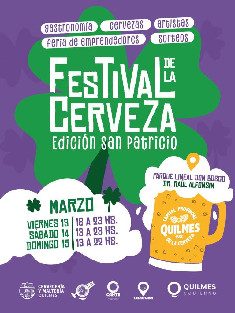 El Municipio de Quilmes invita a las y los vecinos a participar del Festival de la Cerveza – Edición San Patricio, que se desarrollará desde el viernes 13 hasta el domingo 15, en el Parque Lineal de Don Bosco “Dr. Raúl Alfonsín”, ubicado en la intersección de la avenida Caseros y Umberto Illia.