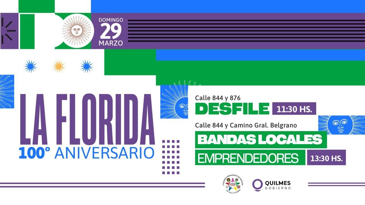 El Municipio de Quilmes invita a las y los vecinos a los festejos por el 100º aniversario de Villa La Florida, que se llevarán adelante el domingo 29, con el tradicional desfile de instituciones locales, feria de emprendedores y stands gastronómicos, y que tendrá una nueva edición del festival Somos Quilmes, con shows artísticos y música en vivo, que contará con el cierre a pura cumbia con La Sonora Master.