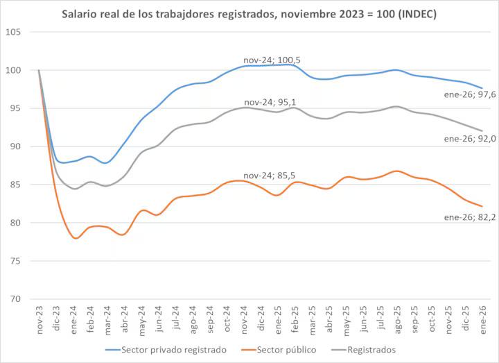 Pero el especialista advierte que “en el tercer trimestre de 2025 la pobreza fue del 27% y en el cuarto subió a 29%. Si bien es algo estacional, muestra un estancamiento en la caída de la pobreza, que tendería a aumentar en el primer semestre de 2026″.