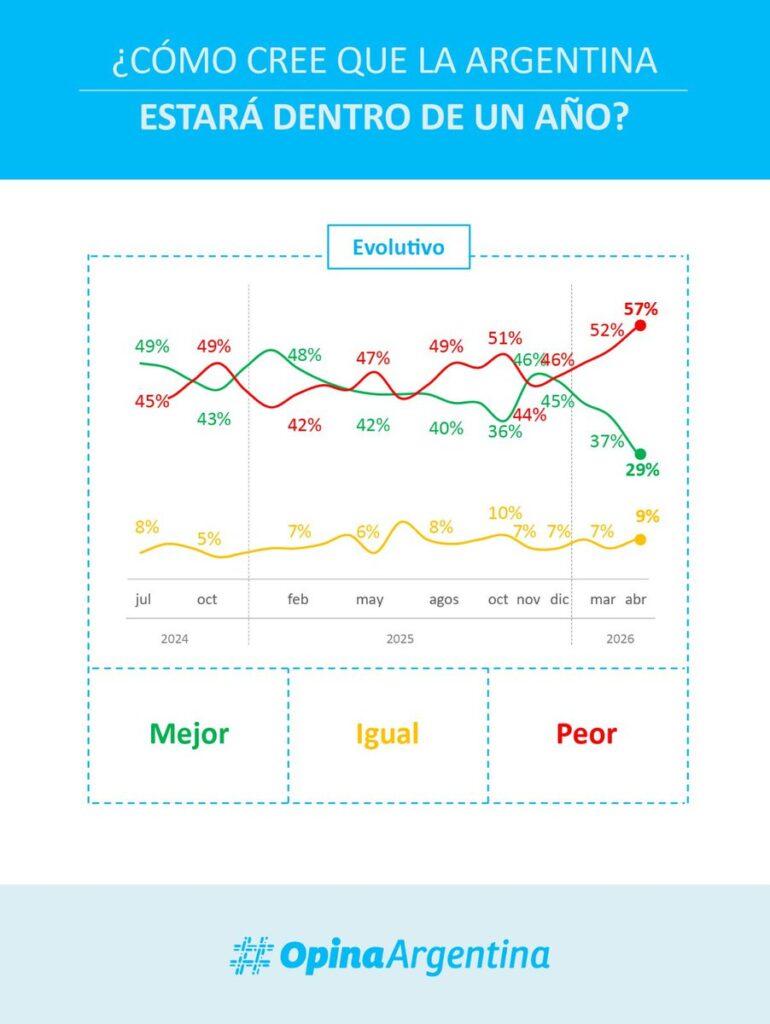 Estos números están en línea con lo que muestran otras consultoras como la prestigiosa Atlas Intel o la de Giacobbe, que es muy cercana a la Casa Rosada. Todas coinciden en que la imagen de Milei está cayendo fuertemente. Según Opina Argentina, incluso el 35% de los que votaron por Milei tienen hoy una imagen negativa del jefe de Estado.