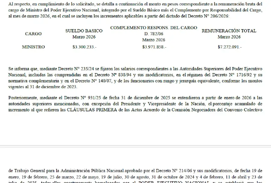 El documento, elaborado por la Dirección Nacional de Sistemas y Estadísticas de Empleo Público y Política Salarial, deja en claro que este esquema alcanza a todos los ministros, al jefe de Gabinete y a las autoridades superiores del Poder Ejecutivo comprendidas en distintos regímenes (decretos 838/94, 1716/92 y 140/07), es decir, secretarios, subsecretarios y funcionarios con rango equivalente. La actualización salarial fue consecuencia directa del decreto 931/2025, firmado por el presidente el 31 de diciembre de ese año, que trasladó a la cúpula del Ejecutivo los aumentos acordados en las paritarias estatales de 2024 y 2025 . De esta norma están exceptuados Javier Milei y la vicepresidenta, Victoria Villarruel, que siguen con sus sueldos congelados.