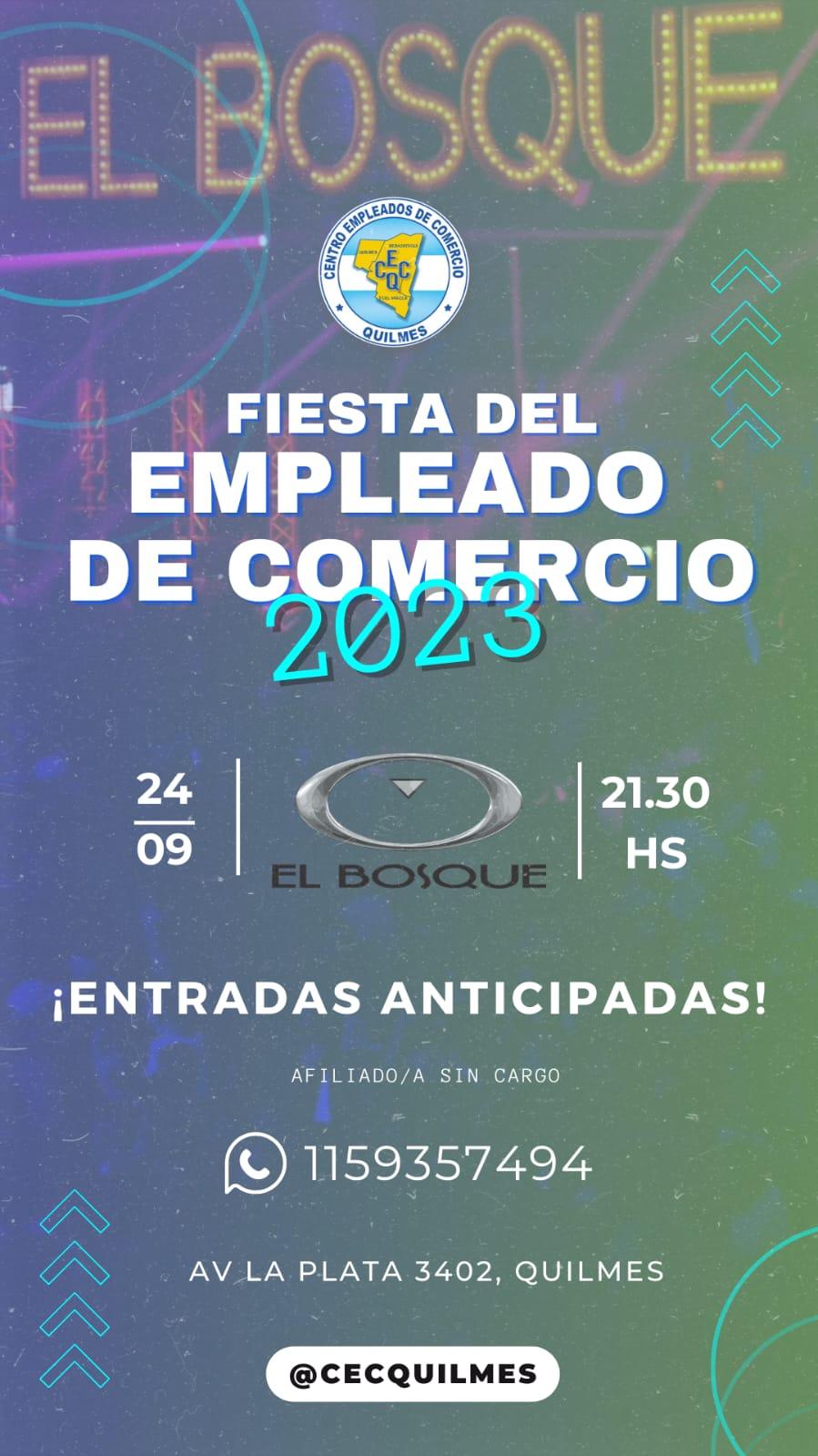 El Centro de Empleados de Comercio de Quilmes encabezado por el «Mata» Rodriguez, invita a los afiliados y afiliadas a participar de un nuevo encuentro para festejar el Día del Empleado de comercio en la instalaciones de El Bosque de Quilmes. Shows, sorteos y muchas sorpresas más!