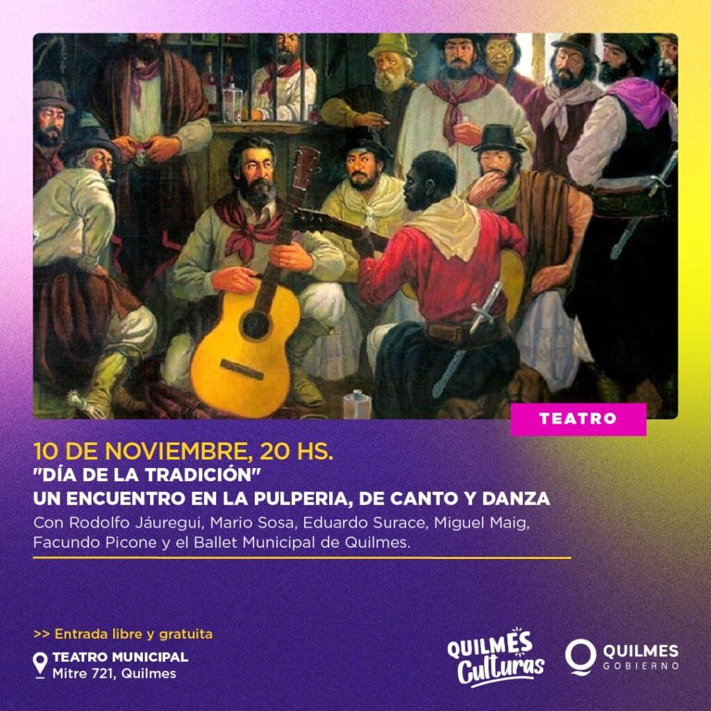 El mismo día, y nuevamente en el Teatro Municipal, a las 20 se celebra el “Día de la Tradición”, un encuentro de pulpería, canto y danza, en recordación del aniversario del nacimiento de José Hernández.