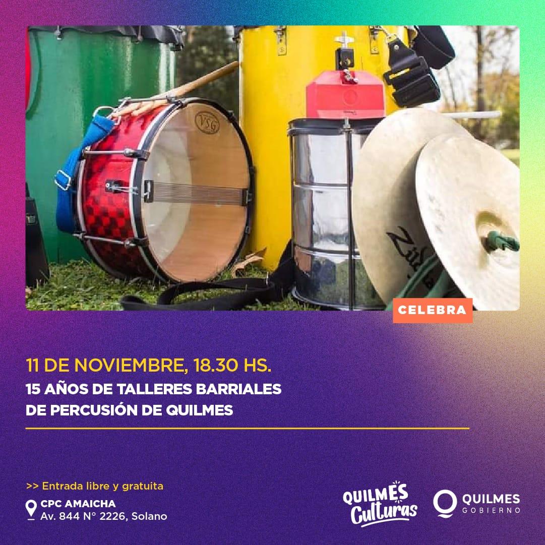 Mientras que en el CPC Amaicha (avenida 844 Nº 2226, San Francisco Solano), será sede desde las 18.30, de la “Muestra de Percusión – 15 años de Talleres Barriales de Percusión en Quilmes”. En 2008 nacieron en Quilmes los Talleres barriales de percusión. De esta manera en 2023 se celebrará esta fecha junto a varios ensambles de diferentes barrios del distrito.