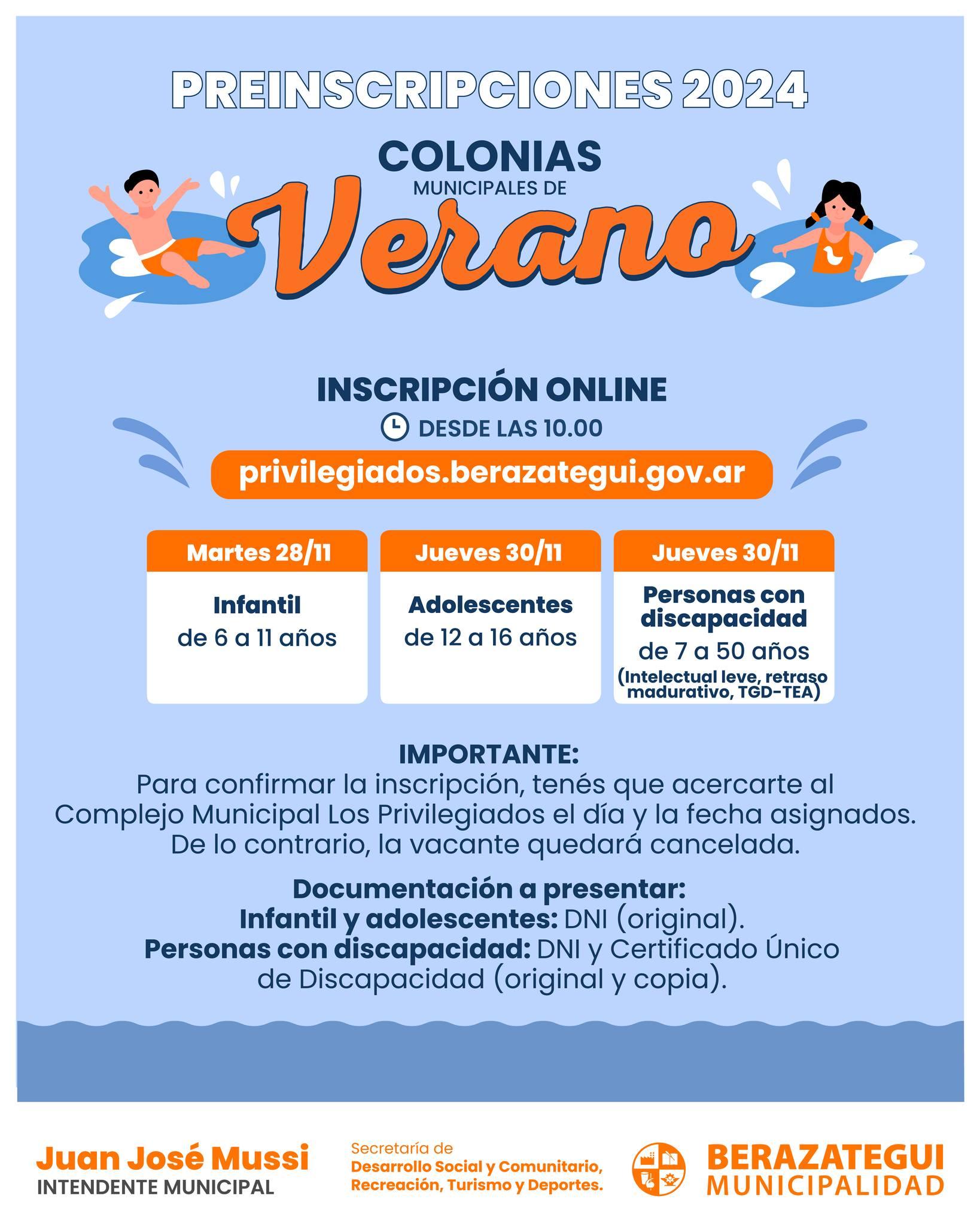 El martes 28 de noviembre abre la inscripción a las colonias municipales de verano que cada año se llevan a cabo en el Complejo Municipal Los Privilegiados. Las mismas son organizadas en forma gratuita por la Municipalidad de Berazategui, a cargo del intendente Juan José Mussi.