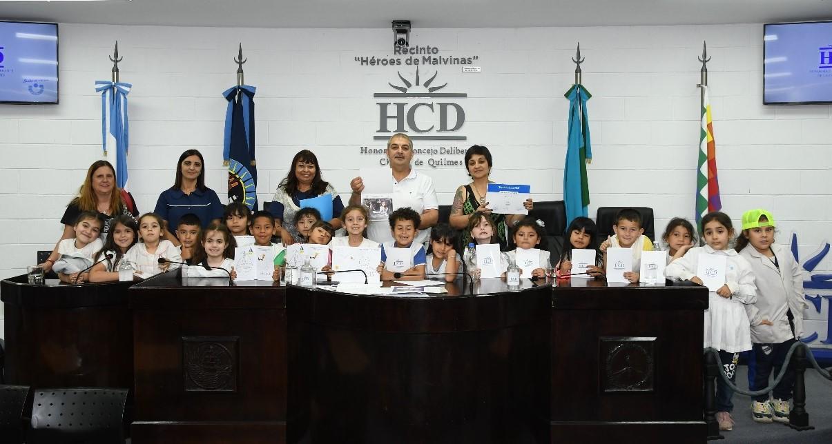 Alumnos de primer grado de la EP N° 17 fueron recibidos, junto a la directora del establecimiento educativo Gisel Marine Arsel, la docente Cecilia Fortino y la bibliotecaria Graciela Conde por el presidente del Concejo Deliberante de Quilmes Fabio Baez y la secretaria Legislativa Edith Llanos.