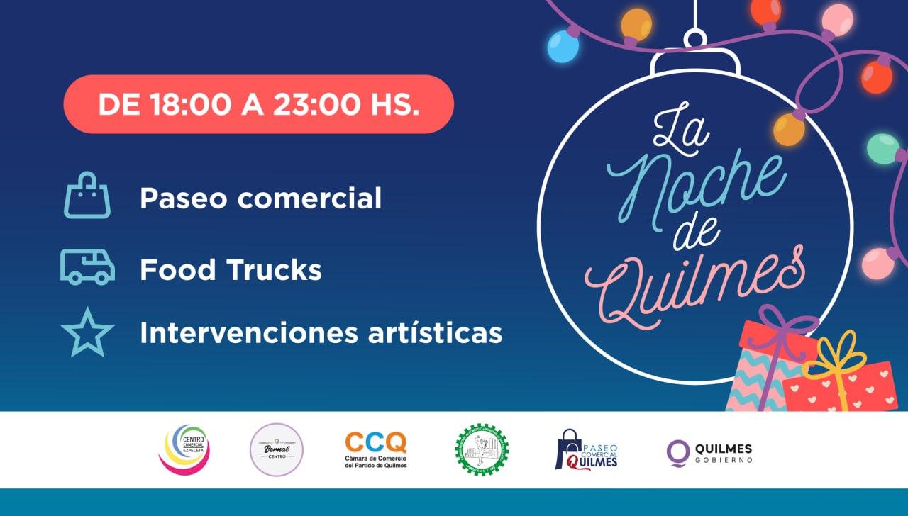 El Municipio de Quilmes informa que desde el martes 19 de diciembre al viernes 22 se llevará adelante “La Noche de Quilmes” en los principales centros comerciales del distrito, en los que nuevamente las vecinas y los vecinos podrán realizar las compras y regalos de Navidad con descuentos y rebajas. Cada localidad tendrá asignada una jornada, en el horario que va de las 18 a las 23. Además, habrá beneficios especiales para los poseedores de la tarjeta Somos Quilmes.