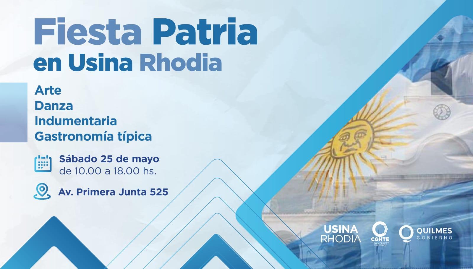 El Municipio de Quilmes invita a la comunidad a celebrar los 214 años de la Revolución de Mayo, con una “Fiesta Patria” en la Usina Rhodia, que se llevará a cabo este sábado 25, de 10 a 18, en el predio de avenida Primera Junta 525, de Quilmes. Habrá exposiciones de arte, shows de danza, venta de indumentaria y una feria gastronómica con comidas típicas para el disfrute de los vecinos y vecinas que asistan al festejo.
