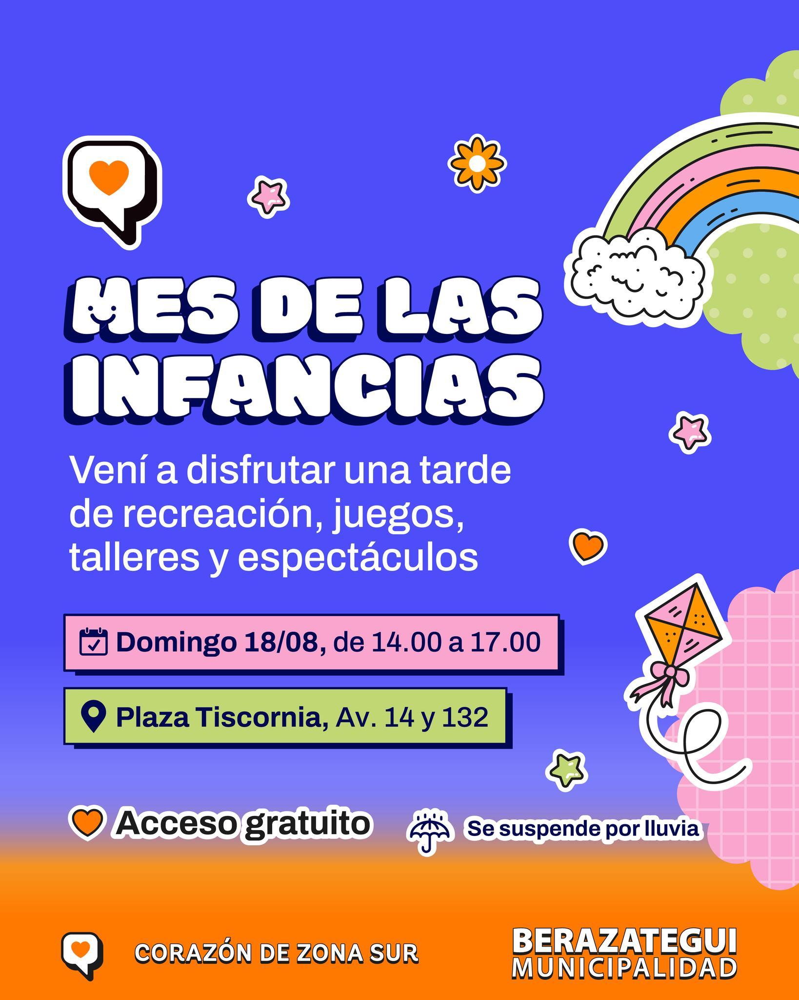 Este domingo 18 de agosto, Berazategui celebrará el Día de la Niñez con una gran jornada festiva en la Plaza Julia Copello de Tiscornia (Av. 14 y 132). Se ofrecerán distintas propuestas recreativas, juegos, talleres y espectáculos para disfrutar en familia, con acceso libre y gratuito, en el horario de 14.00 a 17.00. En caso de lluvia, la actividad quedará suspendida.