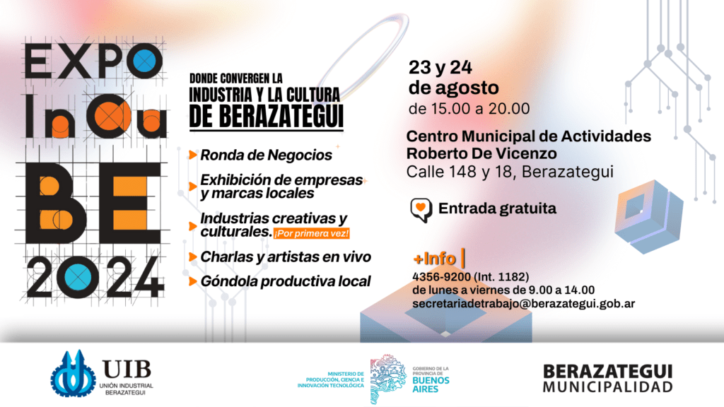 Este viernes 23 y sábado 24 de agosto se realizará la Expo INCUBE 2024, donde convergerán la industria y la cultura de Berazategui. Habrá rondas de negocios, exhibiciones de empresas y marcas locales, charlas y artistas en vivo. Se llevará a cabo en el Centro Municipal de Actividades Roberto De Vicenzo (calle 148 y 18), de 15.00 a 20.00, con entrada libre y gratuita.