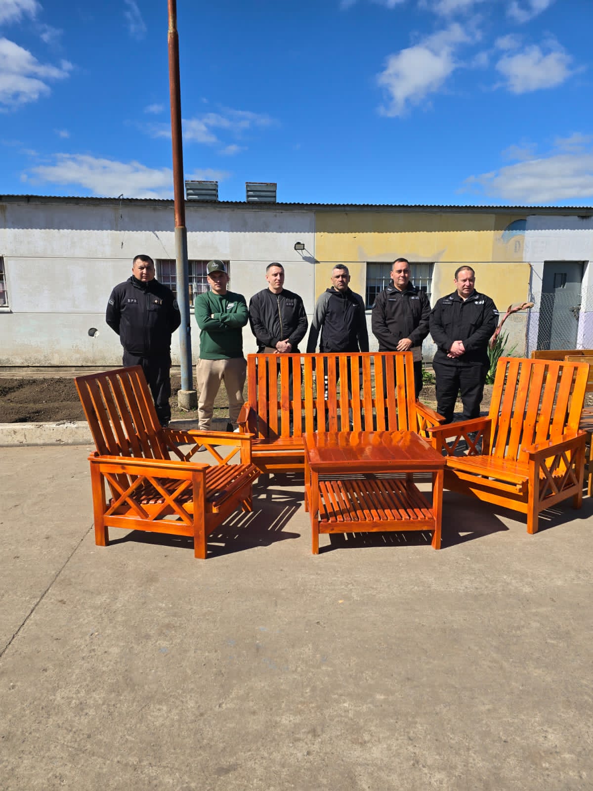Desde el ámbito penitenciario realizaron la entrega del mobiliario el subdirector de Asistencia y Tratamiento, Leonardo Nievas; el jefe del Departamento Regional de Cultura Laboral de la Dirección de Trabajo Penitenciario, Leandro Ambrosi; el jefe de Talleres, Waldemar Guerrero y el jefe de Producción, Juan Smarda.