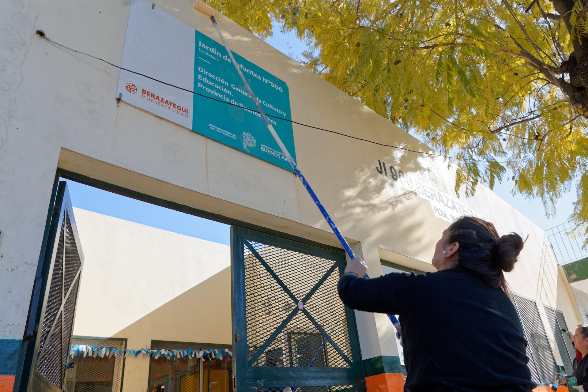 Se hizo una jornada de trabajo en el Jardín de Infantes N° 906 “Mafalda”, el sábado 14 de septiembre, en la que pintaron el frente del establecimiento. El intendente de Berazategui, Juan José Mussi, se acercó al lugar para acompañar la actividad.