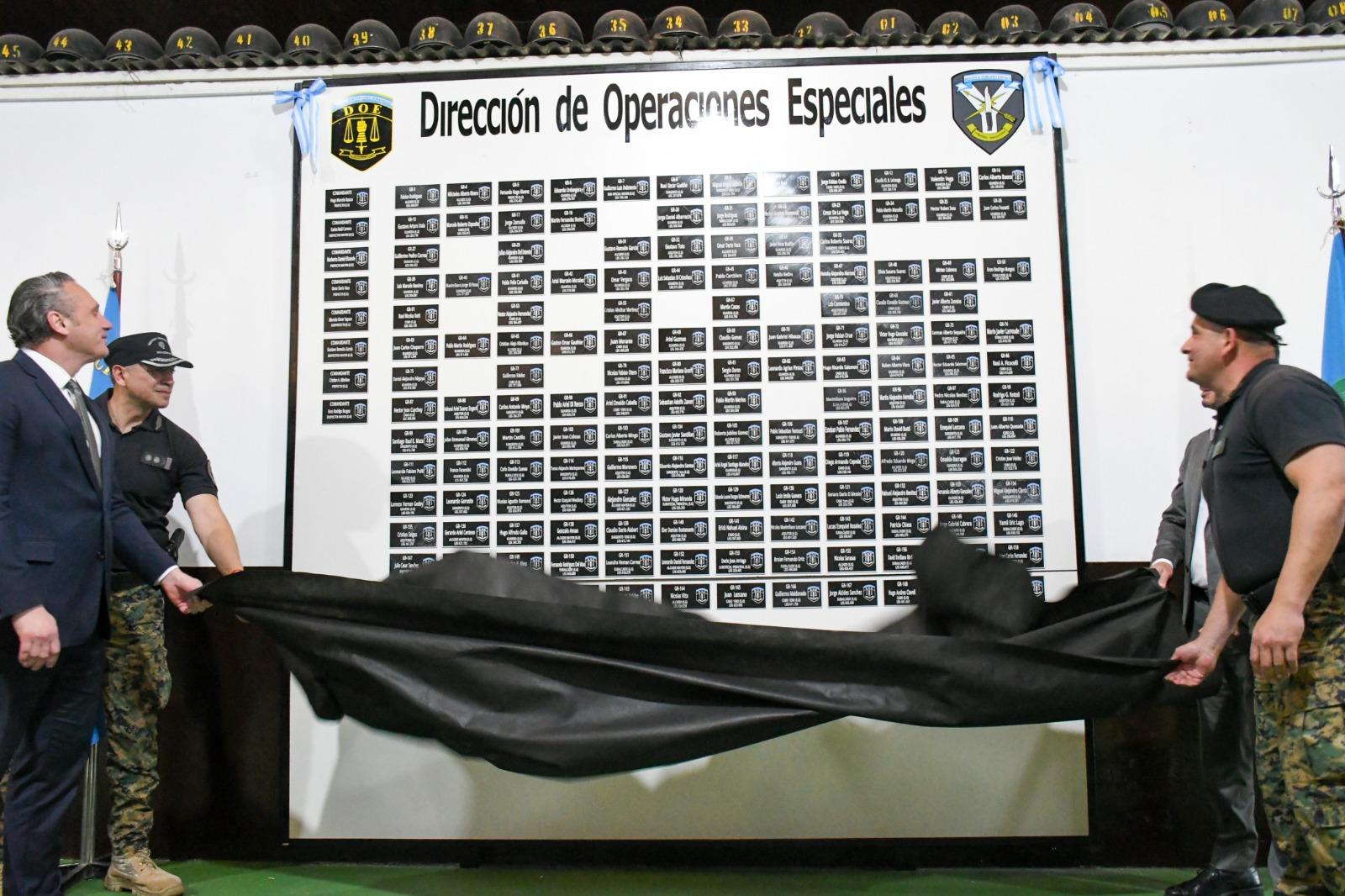Luego, se descubrió un mural de honor en el que se encuentran reflejadas las identificaciones denominadas GR (Grupo de Rescate) correspondientes a los agentes que cuentan con la aptitud de Comando Penitenciario desde la creación del DOE hasta la actualidad, destacándose en el mismo una columna dedicada a quienes cumplieron la función de Comandantes de la Dirección mencionada.