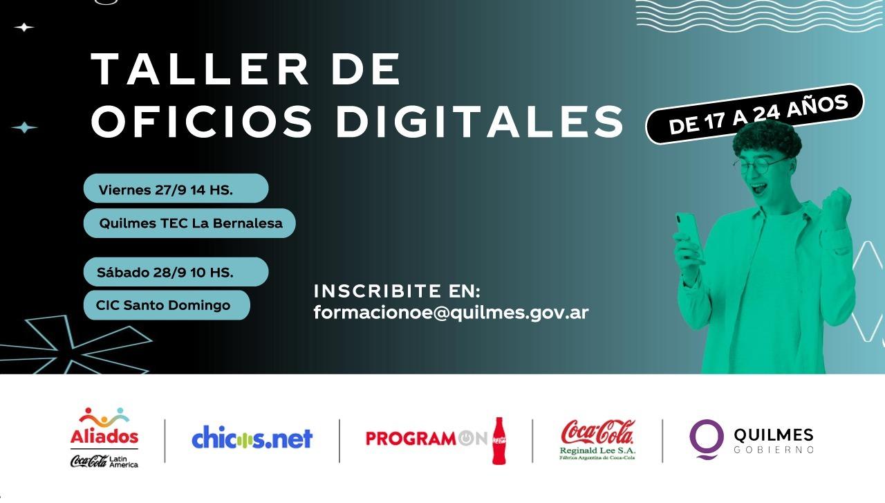El Municipio de Quilmes informa que en una acción articulada con Coca-Cola Reginald Lee, Coca-Cola de Argentina y la Asociación Civil Chicos.net, está abierta la inscripción a los talleres de Oficios Digitales. Habrá dos fechas disponibles: el viernes 27, de 14 a 15.30, en Quilmes TEC sede La Bernalesa (Martín Rodríguez y Lamadrid, Quilmes Oeste); y el sábado 28, de 10 a 11.30, en el CIC Santo Domingo (Bermejo 1099, Bernal Oeste).