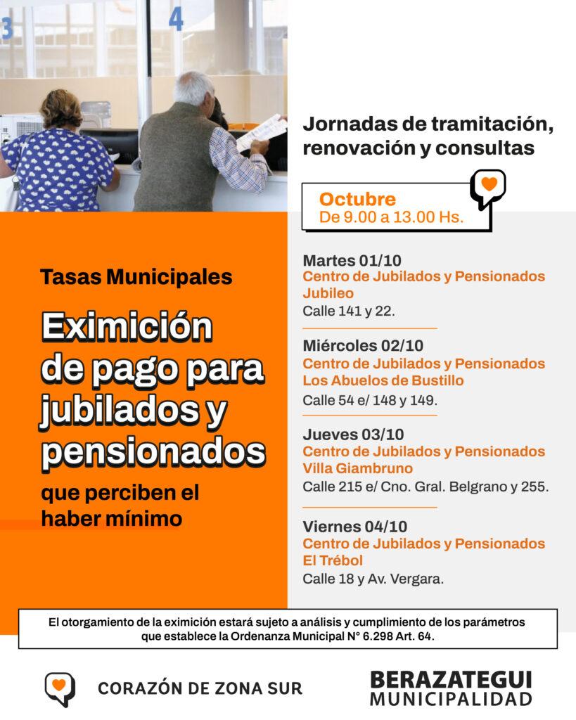 A partir del 1° de octubre, la Municipalidad de Berazategui realizará jornadas de tramitación de eximiciones de las tasas municipales para el año 2025, en los diferentes Centros de Jubilados y Pensionados del distrito, para beneficio de las personas mayores que perciban el haber mínimo. La eximición incluye ABL (Alumbrado, Barrido y Limpieza) y Servicios Sanitarios (agua y cloacas).