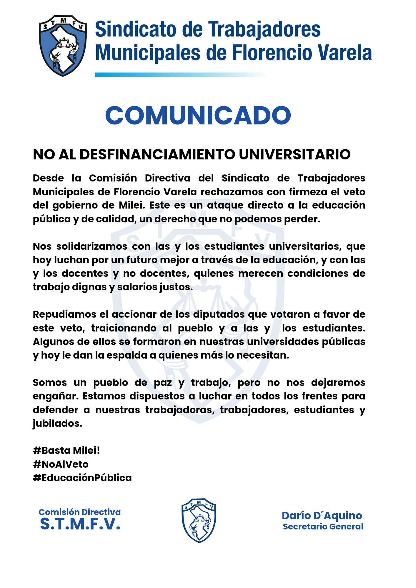 Desde la Comisión Directiva del Sindicato de Trabajadores Municipales de Florencio Varela rechazamos con firmeza el veto del gobierno de Milei. Este es un ataque directo a la educación pública y de calidad, un derecho que no podemos perder.